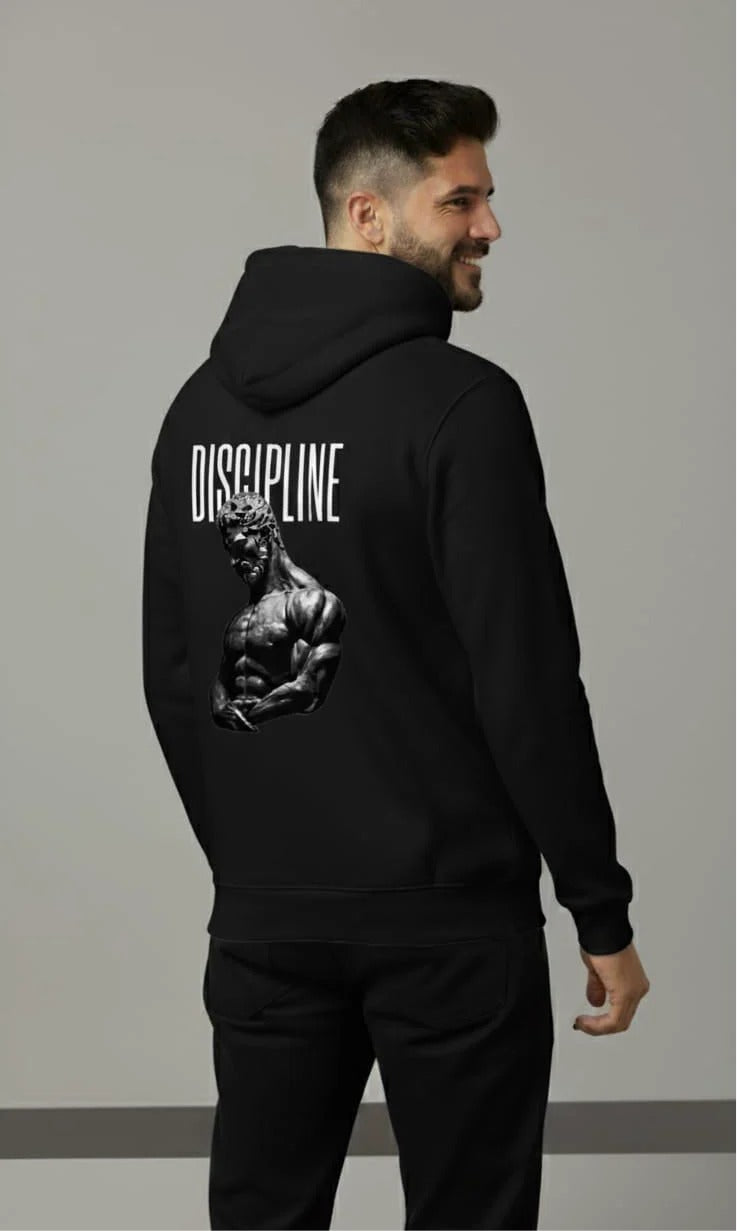Forge your physique and your character. This black/white premium hoodie is a testament to the one thing separating success from wishing: Discipline. Featuring a bold, classic font above a powerful, chiseled anatomical statue, this piece is designed for those who embrace the struggle and commit to the process.